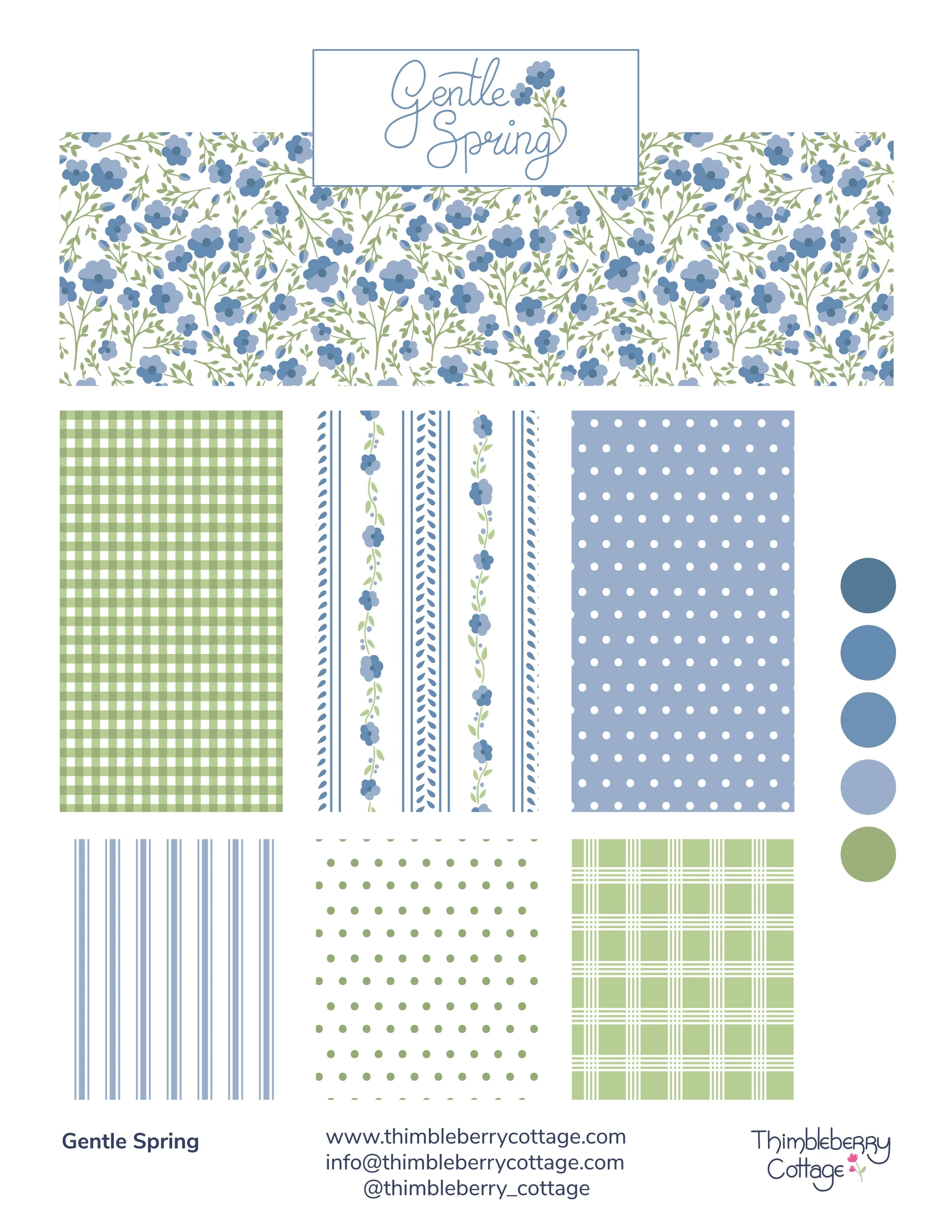 A collection of fresh spring prints in shades of blue and green that are classic and timeless Available now at Spoonflower SHOP NOW For licensing inquiries please email me at: info@thimbleberrycottage.com SEE THE COLLECTION